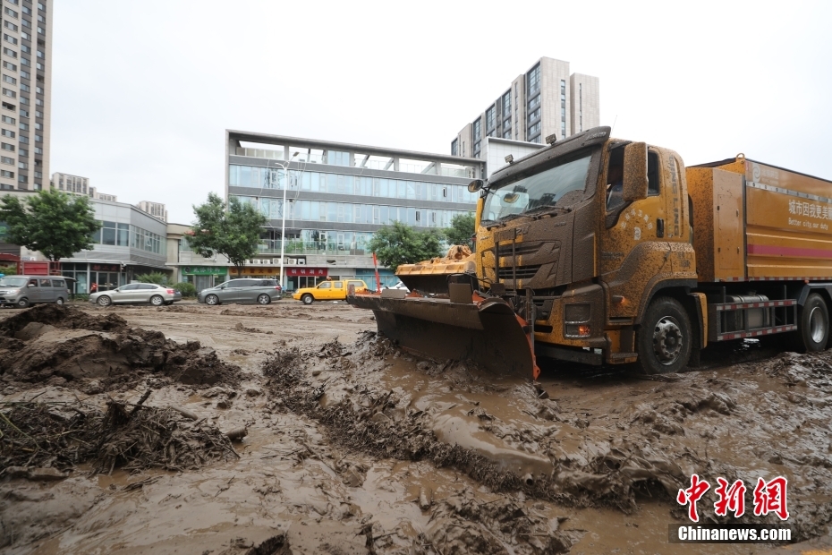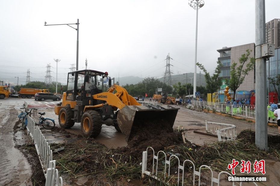 8月1日,北京市門頭溝區(qū),北京環(huán)衛(wèi)集團(tuán)的大型作業(yè)機(jī)械在石龍南路上開展清淤作業(yè)。中新社記者 賈天勇