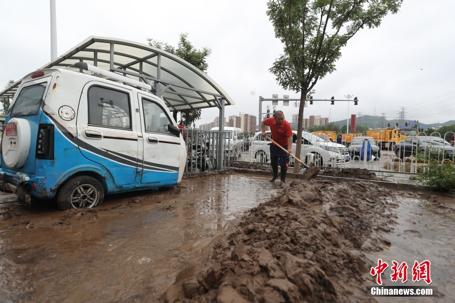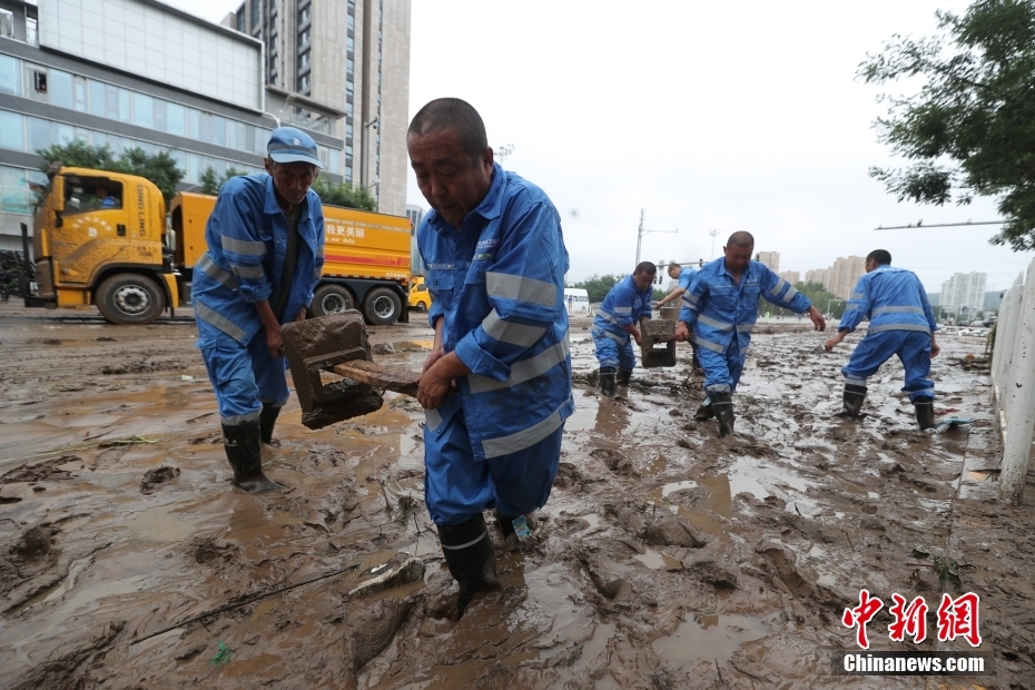 8月1日,北京市門頭溝區(qū),北京環(huán)衛(wèi)集團(tuán)的工人加緊清理便道上的淤泥。中新社記者 賈天勇 攝
