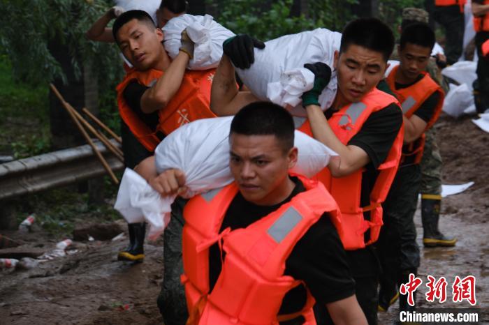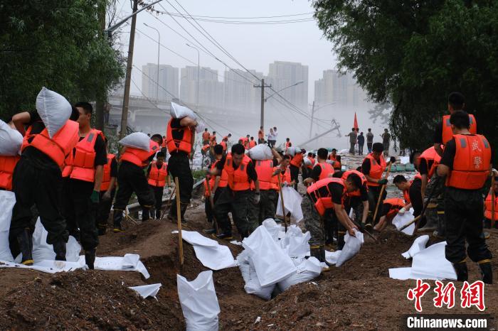 8月1日下午,在永定河京原漫水橋現(xiàn)場,武警北京總隊機動第三支隊200名官兵正在此處實施封堵作業(yè),以防止洪水漫溢,影響周邊百姓。圖為武警官兵修筑堤壩。中新社記者 李太源 攝