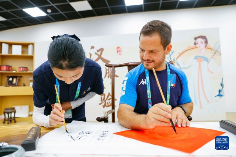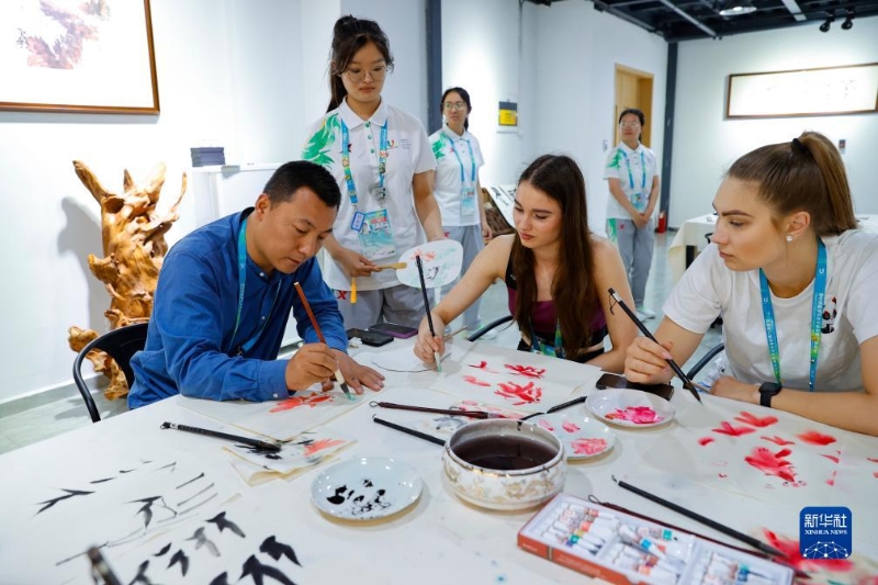 成都大運村里設(shè)置了書法、國畫、蜀繡、傳統(tǒng)樂器等豐富多彩的中國文化互動體驗項目。運動員和教練員在休息之時,紛紛前來感受中國文化的魅力,了解學習中國文化。