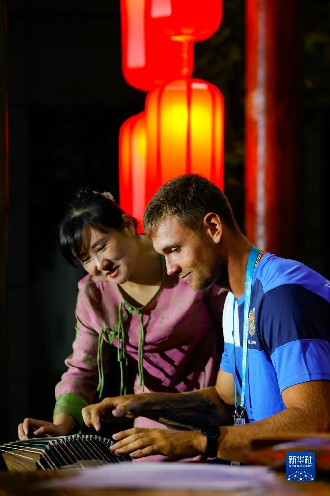7月31日,在成都大運村,四川音樂學院中華傳統(tǒng)音樂研究院研究員王婷在教摩爾多瓦運動員亞歷山大·布洛特體驗古琴演奏技法。