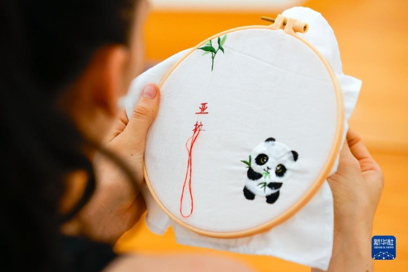 7月31日,在成都大運村,阿根廷運動員亞拉·納瓦羅體驗在蜀繡作品上繡上自己的中文名字。