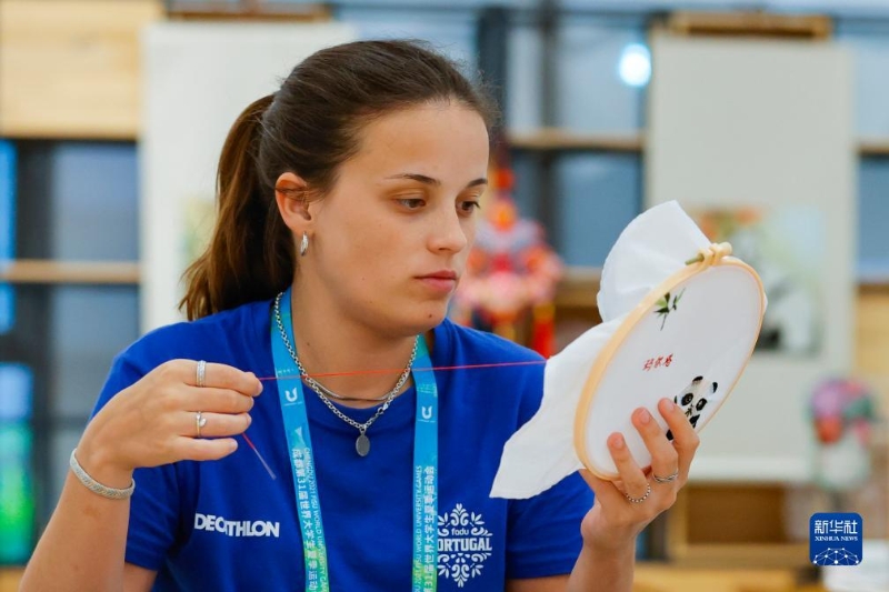 7月31日,在成都大運村,葡萄牙運動員瑪爾塔·卡里德體驗在蜀繡作品上繡上自己的中文名字。