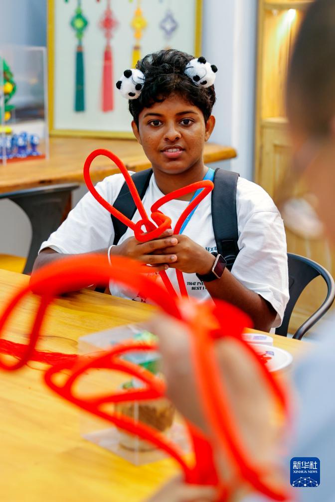 7月31日,在成都大運村,斯里蘭卡運動員哈西妮學習制作中國結(jié)。