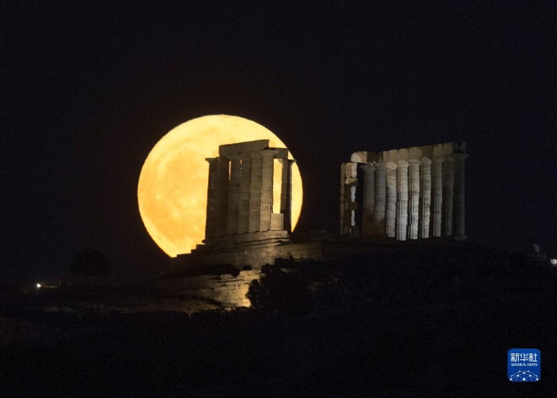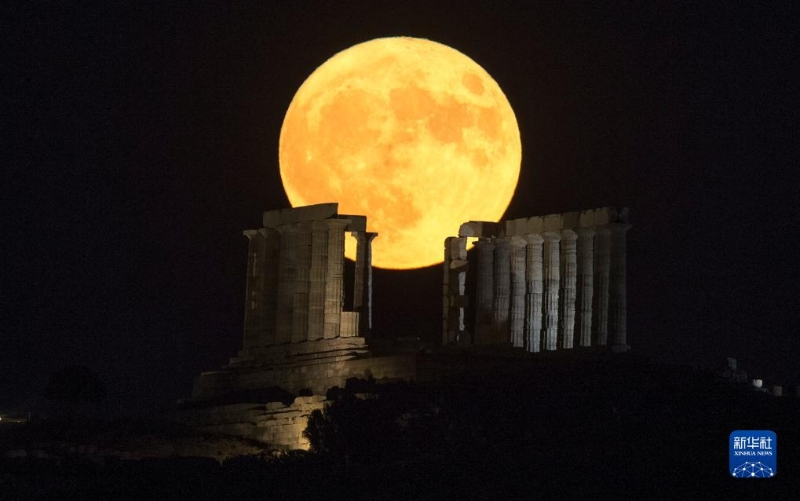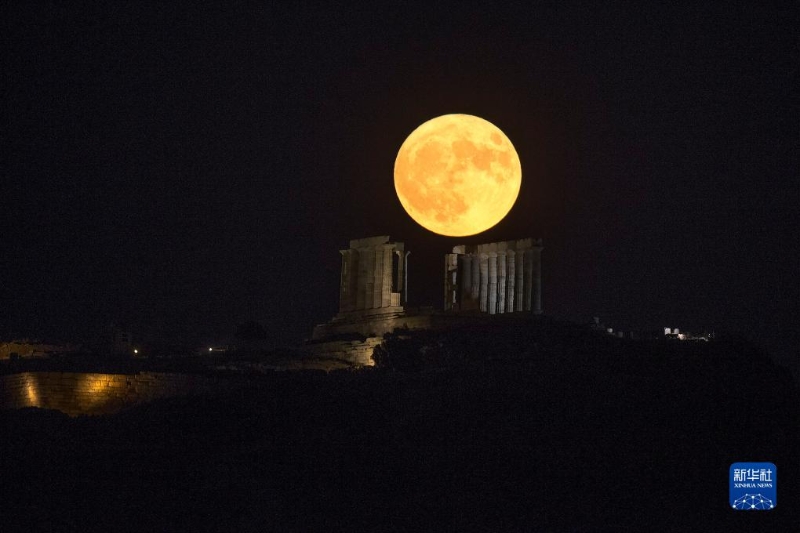 8月1日晚,一輪滿月在希臘雅典附近蘇尼翁角的波塞冬海神廟上空升起。