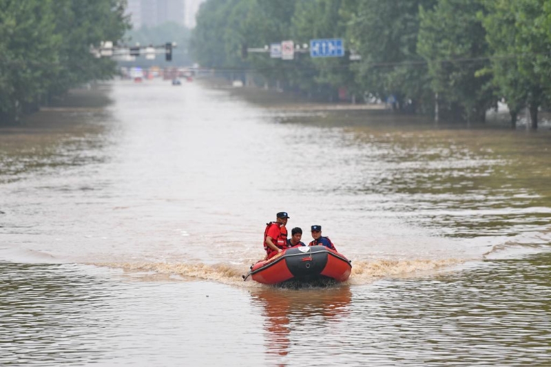 8月2日,救援人員在河北省涿州市市區(qū)內(nèi)駕駛沖鋒舟轉(zhuǎn)移群眾。新華社記者 牟宇 攝