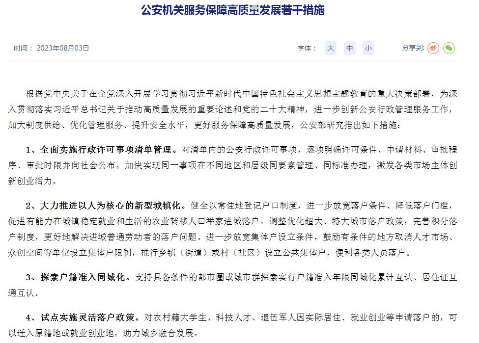8月3日,公安部發(fā)布公安機關服務保障高質(zhì)量發(fā)展若干措施,其中在戶籍政策方面提出一系列舉措。