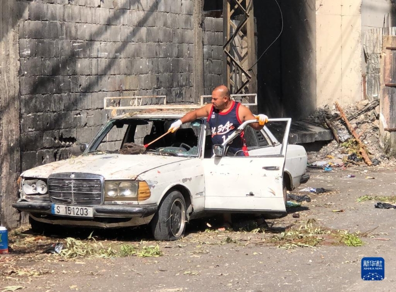 8月1日,在黎巴嫩南部西頓市附近的艾因·哈勒瓦難民營,一名巴勒斯坦男子查看汽車受損情況。新華社發(fā)(阿里·哈希紹攝)