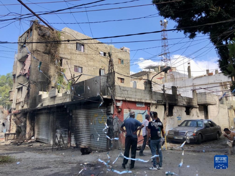 8月1日,在黎巴嫩南部西頓市附近的艾因·哈勒瓦難民營,幾名巴勒斯坦男子查看財產(chǎn)受損情況。新華社發(fā)(阿里·哈希紹攝)