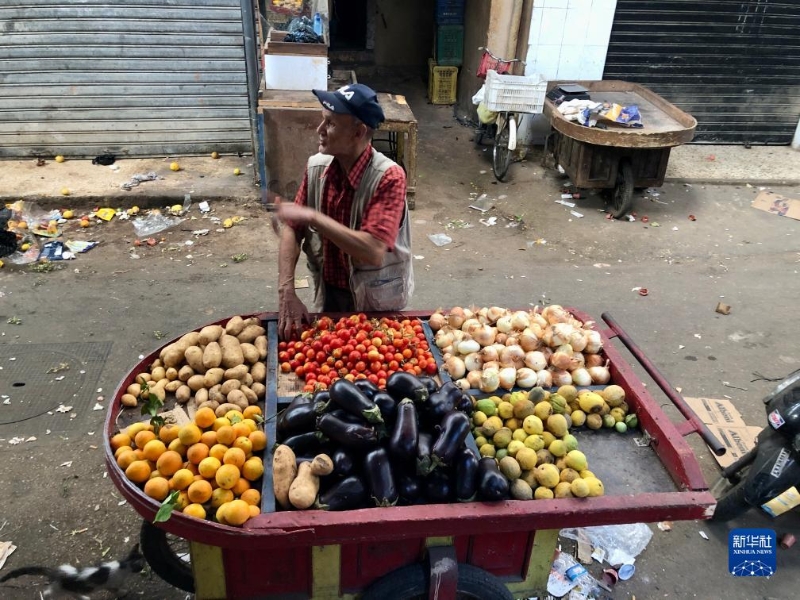 8月1日,在黎巴嫩南部西頓市附近的艾因·哈勒瓦難民營,一名男子在街上賣菜。新華社發(fā)(阿里·哈希紹攝)