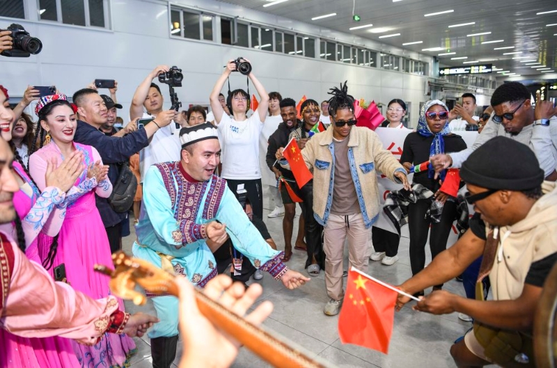 音樂聲響,曼舞飛揚。在出口大廳,還沒來得及放下背包,這些來自南非埃爾維斯舞蹈藝術(shù)團的成員就學(xué)起新疆舞,隨后展示了南非祖魯舞,旅途疲勞一掃而空。
