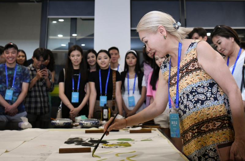 在新疆美術(shù)館,吉爾吉斯斯坦國立白鹿舞蹈團演職人員在體驗中國畫(7月28日攝)。新華社記者 王菲 攝