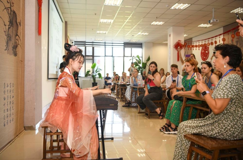 在新疆圖書館,烏魯木齊古箏愛好者為國外歌舞團演員演奏《漁舟唱晚》(7月23日攝)。新華社記者 胡虎虎 攝