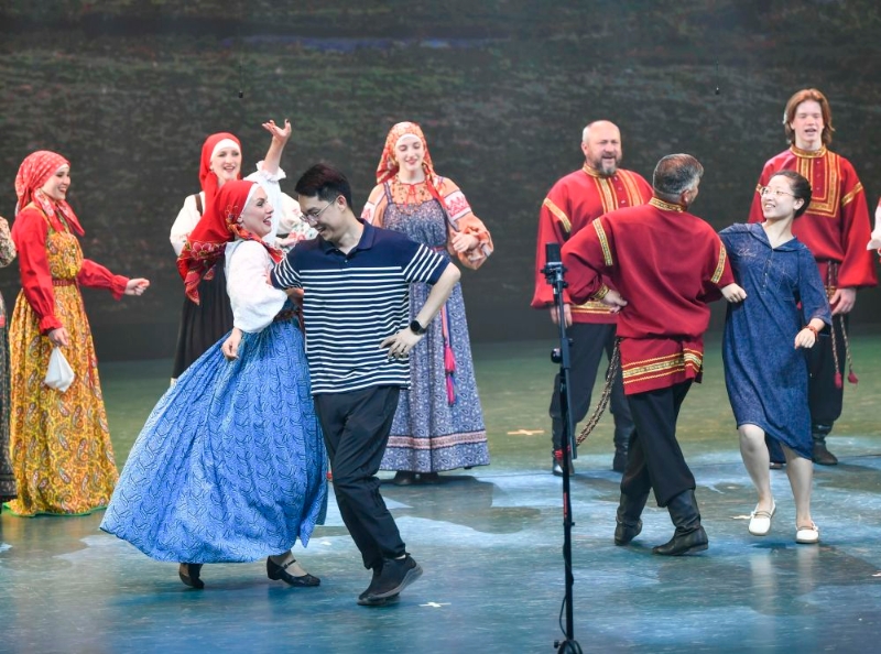 在烏魯木齊晚報劇院,俄羅斯薩拉托夫州曙光歌舞團的演員們邀請現(xiàn)場觀眾同臺共舞(7月22日攝)。新華社記者 胡虎虎 攝