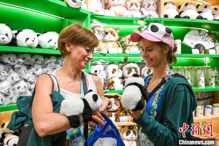 8月1日,成都大運(yùn)會期間,成都大熊貓繁育研究基地成為參賽代表團(tuán)的熱門打卡點(diǎn),圖為匈牙利選手凡妮(右)選購大熊貓玩偶。中新社記者 趙文宇 攝