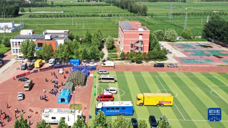8月6日,在平原縣王打卦中心小學(xué),應(yīng)急救援隊(duì)伍集結(jié)待命(無人機(jī)照片)。新華社記者 郭緒雷 攝