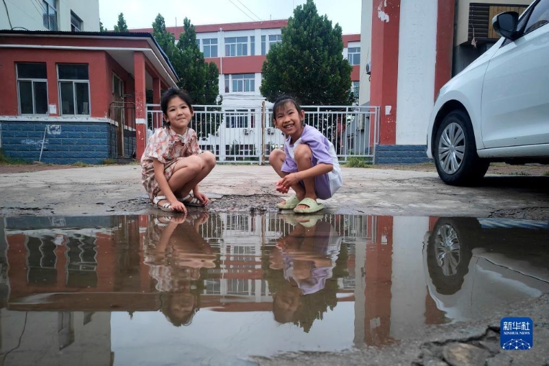 8月6日,在平原縣王打卦鎮(zhèn),兩名小朋友在水邊玩耍。新華社記者 郭緒雷 攝