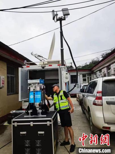 8月6日,移動(dòng)通信搶險(xiǎn)突擊隊(duì)利用應(yīng)急衛(wèi)星車+系留式無人機(jī)一體化設(shè)備,易縣坡倉(cāng)基站緊急搶通。樊文錦 攝