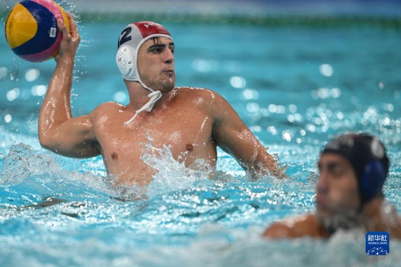 8月8日,匈牙利隊球員博比什(左)在比賽中防守。新華社記者 陳澤國 攝