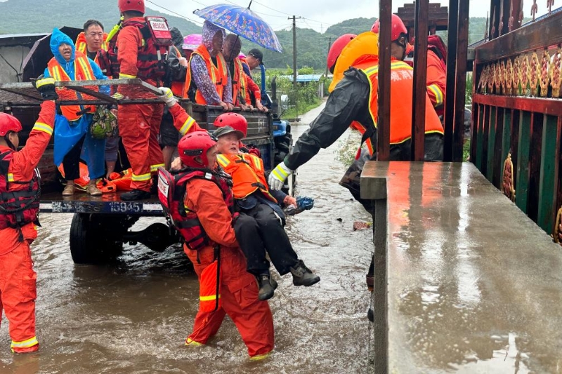 8月4日,在黑龍江省尚志市一面坡鎮(zhèn)萬山村,哈爾濱市森林消防支隊(duì)的消防員正在解救被困村民。新華社發(fā)