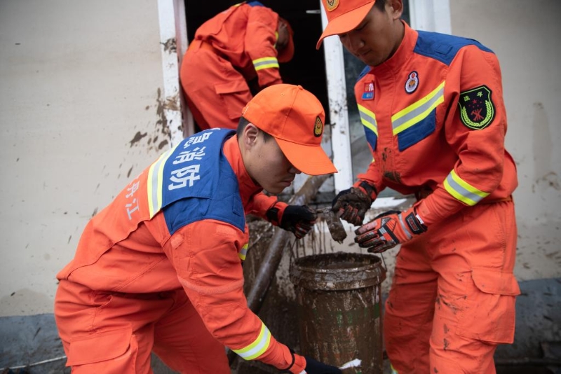 8月6日,在大海林林業(yè)局有限公司自來水供應(yīng)站,消防救援人員在清理淤積。新華社記者張濤 攝