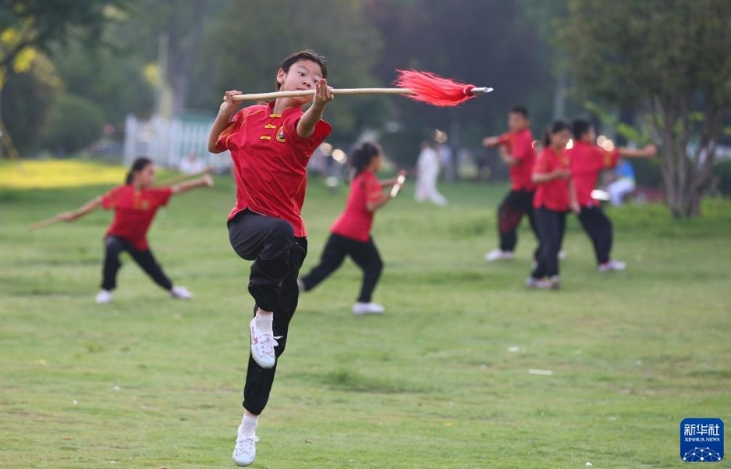 8月8日,在山東省滕州市市民公園,孩子們在練習(xí)武術(shù)。