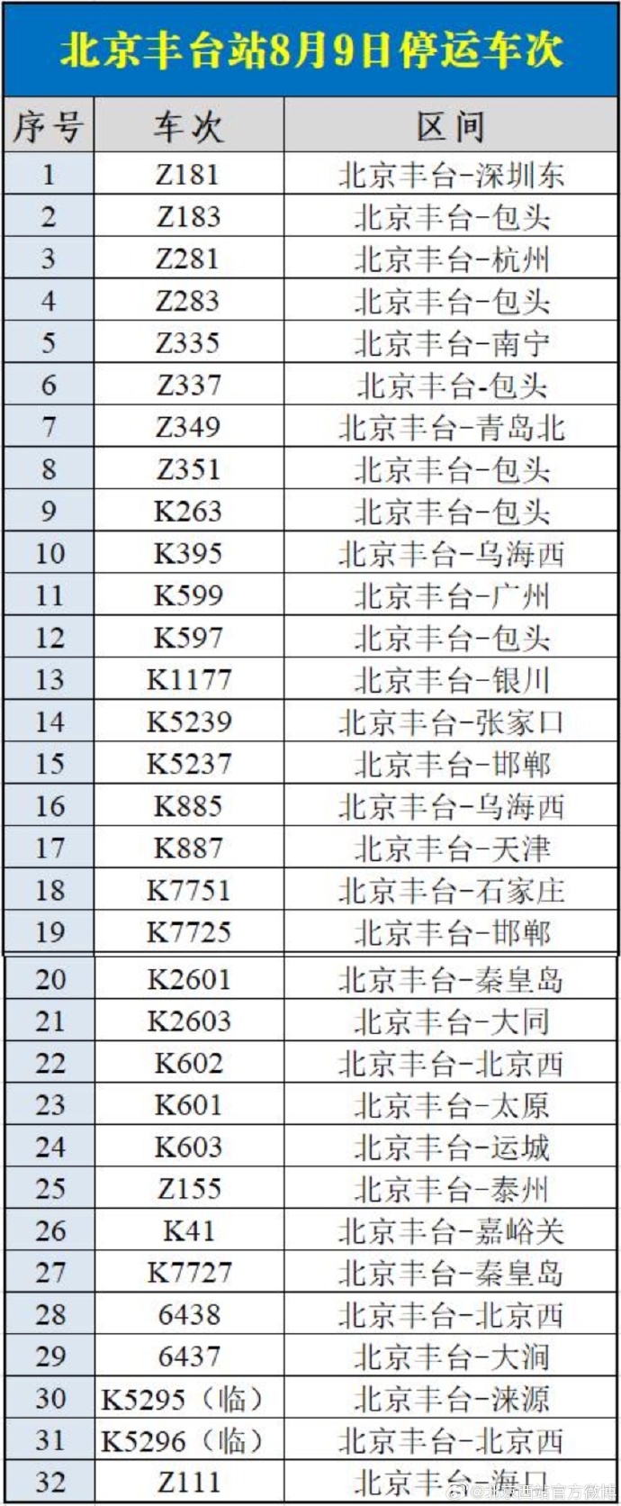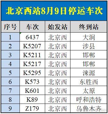 中新網(wǎng)8月9日電 據(jù)北京西站官方微博消息,受水害影響,8月9日北京西站、北京豐臺站部分列車停運,已購買停運列車車票的旅客,可于30日內(nèi)辦理全額退票手續(xù)。請廣大旅客合理安排出行,關(guān)注鐵路部門公告。
