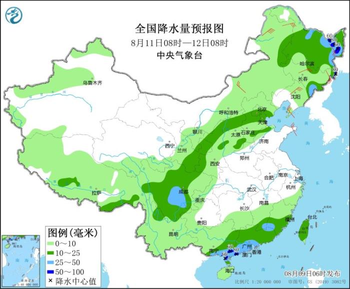 8月11日08時(shí)至12日08時(shí),內(nèi)蒙古東北部、黑龍江、吉林中東部、甘肅東部、陜西中北部、山西、河北中部和南部、北京、四川盆地中西部、廣西東部和南部、廣東、福建南部、臺灣島等地部分地區(qū)有中到大雨,其中,黑龍江東北部、吉林東部、廣西南部沿海、廣東西南部等地部分地區(qū)有暴雨(50~80毫米)。內(nèi)蒙古東部、黑龍江東部、吉林中東部、遼寧中東部、山東半島等地部分地區(qū)有4~6級風(fēng)(見圖3)。
