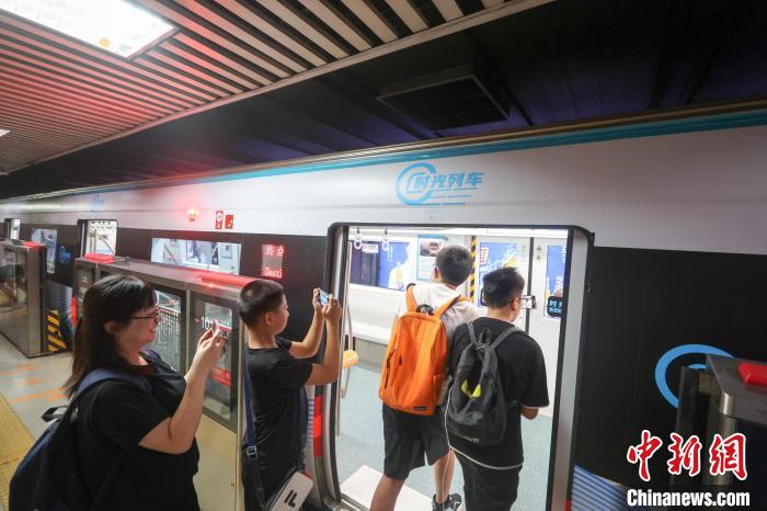 8月8日,北京地鐵“時光列車”在1號線八通線上線試運營。圖為乘客在車廂內打卡拍照。中新社記者 賈天勇 攝