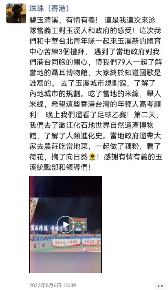 “玉溪非常不錯(cuò),城市很干凈,發(fā)展得也很好?!迸_(tái)灣林教練說(shuō),“玉溪人民很熱情,天氣也很好,這段時(shí)間臺(tái)灣是非常炎熱的,這里就很涼快。”來(lái)自香港的家長(zhǎng)袁女士也表示:“玉溪是個(gè)有情有義的城市,這是我這次來(lái)泳隊(duì)當(dāng)義工對(duì)玉溪人民和政府的感受,我們感受到了當(dāng)?shù)卣畬?duì)我們港臺(tái)同胞的關(guān)心,感謝玉溪市委統(tǒng)戰(zhàn)部,感謝政府領(lǐng)導(dǎo),感謝玉溪人民!”(來(lái)源:玉溪市委臺(tái)辦)