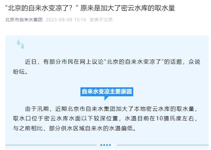 就自來水變涼主要原因,北京自來水集團(tuán)表示,由于汛期,近期北京市自來水集團(tuán)加大了本地密云水庫的取水量,取水口位于密云水庫水面以下較深位置,水溫目前在10攝氏度左右,與之前相比,部分供水區(qū)域自來水的水溫偏低。