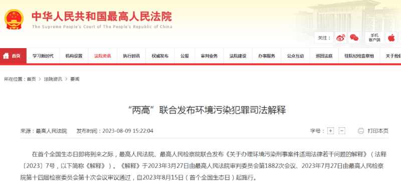 在首個全國生態(tài)日即將到來之際,最高人民法院、最高人民檢察院8月9日聯(lián)合發(fā)布關(guān)于辦理環(huán)境污染刑事案件適用法律若干問題的解釋。該司法解釋根據(jù)刑法修改情況,針對司法實(shí)踐中的新問題,從司法環(huán)節(jié)發(fā)力,依法嚴(yán)懲環(huán)境污染犯罪。