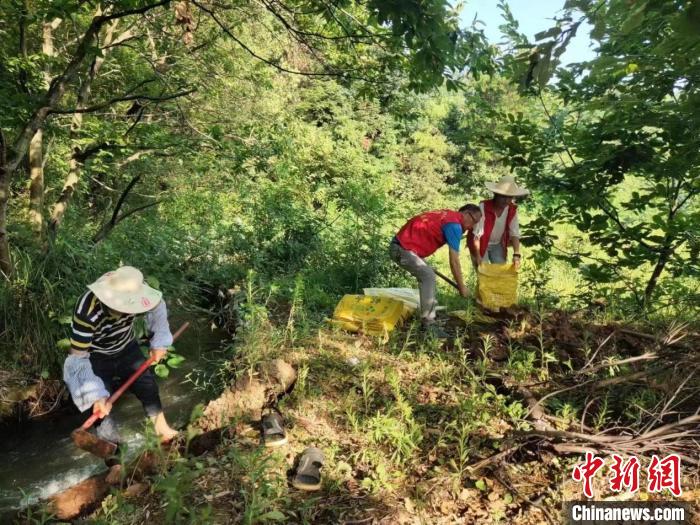 祁陽(yáng)三口塘鎮(zhèn)由鎮(zhèn)、村黨員干部組成的護(hù)水隊(duì)正在清渠護(hù)水。祁陽(yáng)市委宣傳部供圖