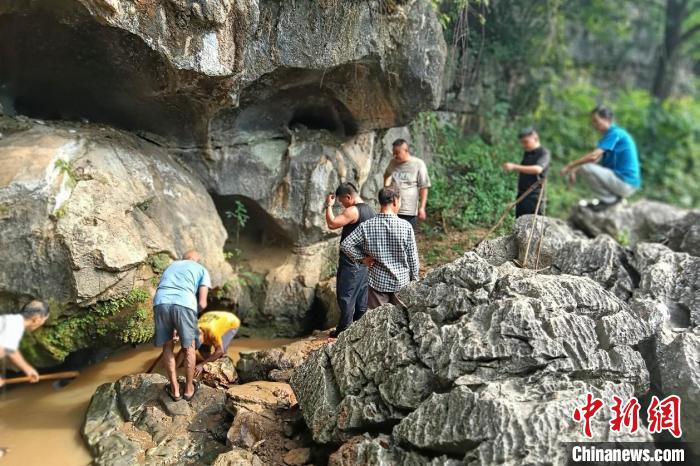 祁陽(yáng)市梅溪鎮(zhèn)黨員干部帶領(lǐng)群眾正在清理巖洞淤塞,從巖洞引水抗旱。祁陽(yáng)市委宣傳部供圖