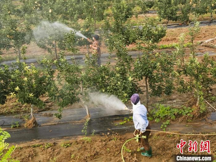 8月9日,易縣牛崗鄉(xiāng)臺(tái)底村果農(nóng)為果樹噴灑農(nóng)藥。呂子豪 攝