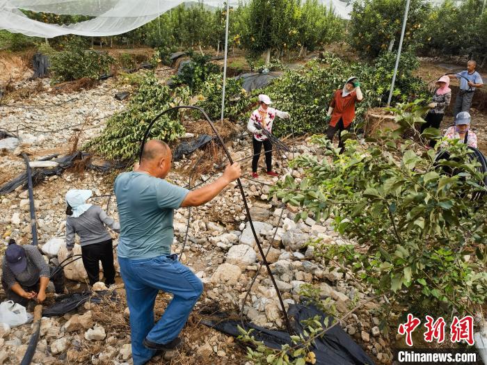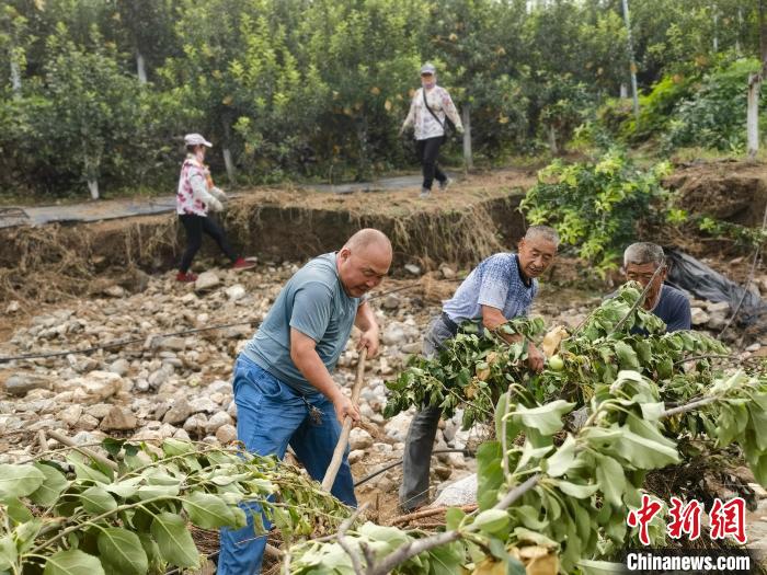 中新網(wǎng)保定8月9日電 (呂子豪 徐巧明)8月9日,中新網(wǎng)記者在河北省易縣牛崗鄉(xiāng)臺(tái)底村蘋果示范園看到,該村黨支部書記牛全江正帶領(lǐng)村民整理移除沖毀的果樹,修復(fù)水肥一體化設(shè)施和防草布。