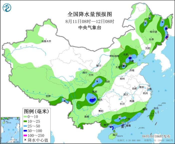 圖2 全國降水量預(yù)報圖(8月10日08時-11日08時)