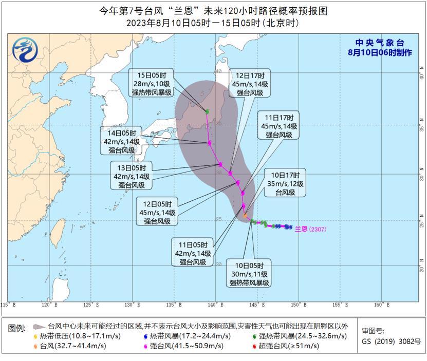 另外,今年第7號臺風“蘭恩”(LAN)今晨中心附近最大風力有11級(30米/秒),中心最低氣壓為980百帕,七級風圈半徑280-380公里,十級風圈半徑60-80公里。預計,“蘭恩”將以每小時5-10公里的速度向西北方向移動,強度逐漸加強。