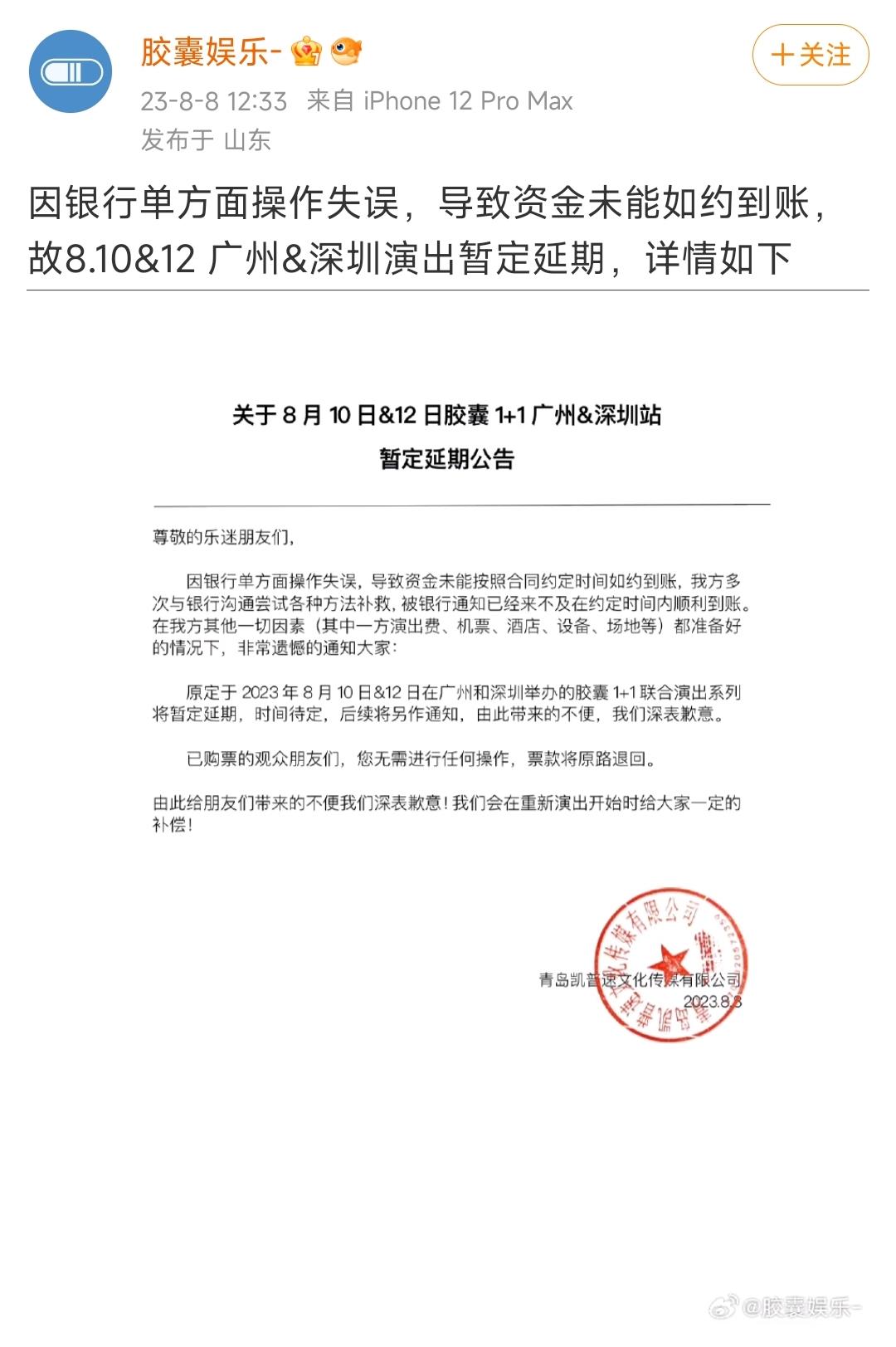 “膠囊娛樂”宣布另一演出延期。微博截圖