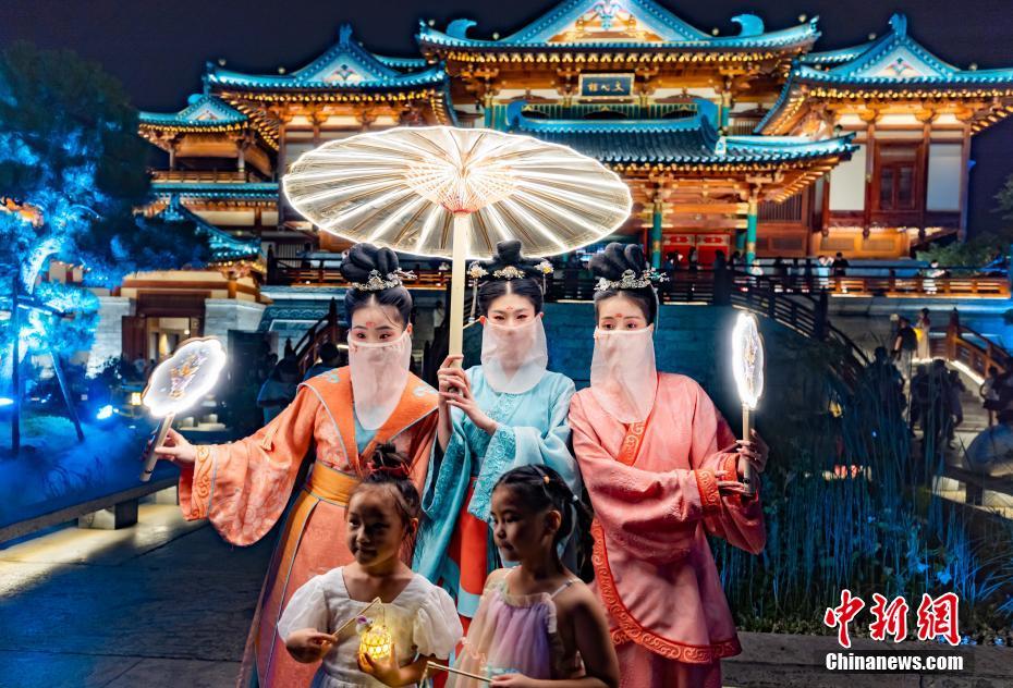 8月10日晚,江蘇南京,演員身著古裝在金陵小城·燕集里與孩子們合影。金陵小城·燕集里位于牛首山文化旅游區(qū),移步易景的場景變化再現(xiàn)金陵(南京古稱)盛景。中新社記者 泱波 攝