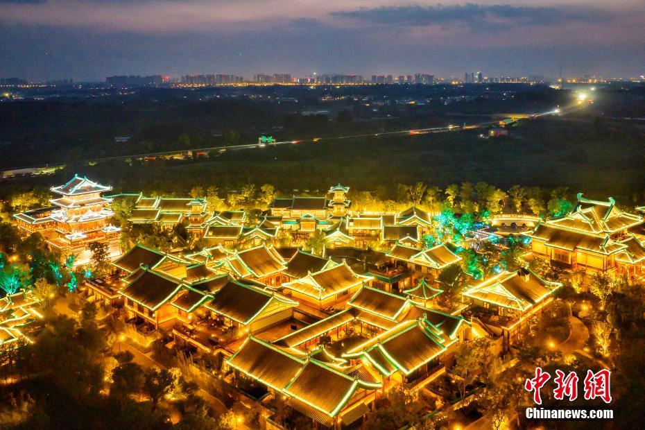 8月10日晚,江蘇南京,航拍位于牛首山文化旅游區(qū)的金陵小城·燕集里,流光溢彩再現(xiàn)金陵(南京古稱)盛景。(無人機(jī)照片) 中新社記者 泱波 攝