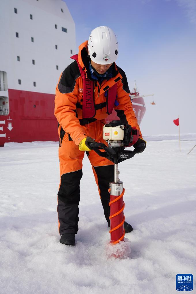 北京時間凌晨5時左右,“雪龍2”號搜尋到合適的作業(yè)海冰。經(jīng)先遣科考隊員探察完冰面安全區(qū)域后,執(zhí)行首站海冰綜合調查作業(yè)的科考隊員攜帶科考設備,沿著舷梯步行下冰。隨后,科考隊員分別進行了海冰物質平衡浮標布放、海冰冰芯采集、無人機海冰光學觀測等9項作業(yè)。整個過程持續(xù)約5小時。