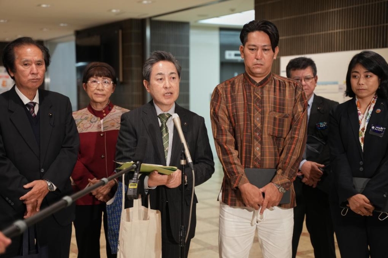 4月25日,在日本東京外務(wù)省,沖繩縣議員當(dāng)山勝利(左三)接受記者采訪。日本沖繩縣議員代表團(tuán)分別于4月24日和25日在首都東京向日本防衛(wèi)省、日本內(nèi)閣府和日本外務(wù)省遞交了該縣議會通過的和平外交意見決議書,呼吁日本政府不要讓沖繩淪為戰(zhàn)場,而應(yīng)通過對話和外交方式和平解決問題。新華社記者張笑宇攝