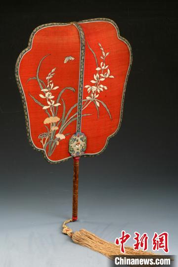 清宮扇子的功能不局限于消暑,更是一種裝飾、一種藝術(shù)品、一種文化。據(jù)張國斌介紹,以沈陽故宮院藏的清檀木柄大紅緙絲蘭蝶扇為例,此扇為清宮后妃日常生活用品。扇頂部微向后彎曲,便于扇用;扇面為大紅地,以緙絲工藝制蘭花花卉,蘭花根部長有靈芝,上部彩緙蝴蝶;扇骨及邊框以彩繡錦邊包鑲;扇柄為木制,表面刻有花卉紋、弦紋,柄兩頭鑲有染紅色骨飾,柄底部系有黃色絲穗。