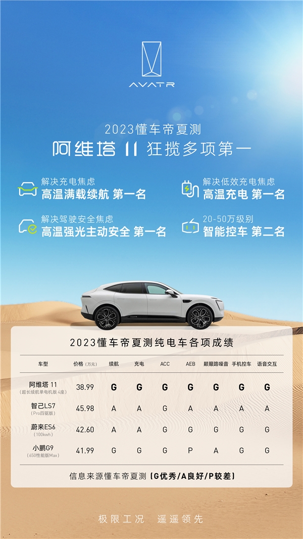 當然,想要持續(xù)獲得市場認可,取得令人滿意的銷售成績,最終還是要看產品力。據悉,在懂車帝2023年夏季測試中,阿維塔11在高溫續(xù)航、高溫充電速度、高溫強光下主動安全等環(huán)節(jié)斬獲第一名,超越一眾熱門車型,并且它還在七項測試中獲得“G級認證”。