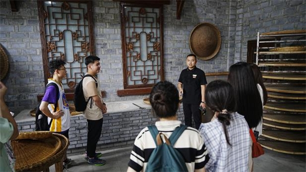 圖為茶村負(fù)責(zé)人向?qū)嵺`團成員講解關(guān)于茶葉加工的知識