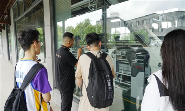 圖為茶村負(fù)責(zé)人向?qū)嵺`團介紹信陽毛尖的現(xiàn)代化加工設(shè)備
