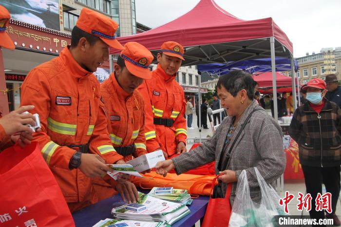 圖為消防員正在為民眾發(fā)放印有防災(zāi)減災(zāi)知識(shí)的禮品。西繞拉翁 攝