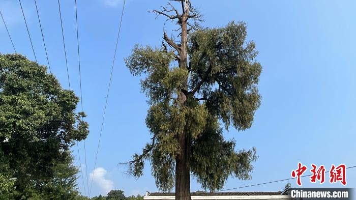 中新社湘潭8月15日電 (張雪盈)一株高約35米的垂絲香柏直上云霄,其樹冠處多已干枯,其下卻依舊枝繁葉茂,隱約可見鳥兒筑巢枝上,頗顯生機(jī)。懸在樹干處的身份銘牌顯示,該株垂絲香柏樹齡約880年,被定為一級(jí)古樹。