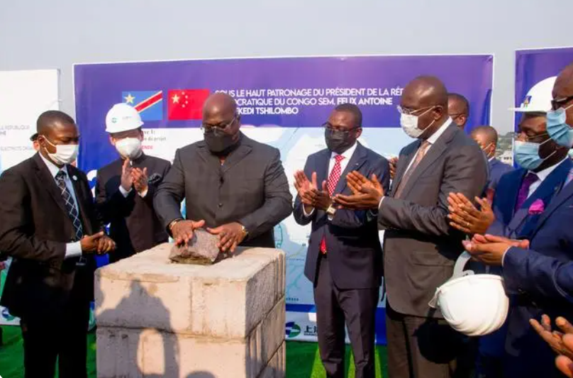 2021年7月27日,剛果(金)總統(tǒng)齊塞克迪(左三)在首都金沙薩的中剛合作項(xiàng)目開(kāi)工儀式上為項(xiàng)目奠基。新華社發(fā)(中國(guó)駐剛果(金)大使館供圖)